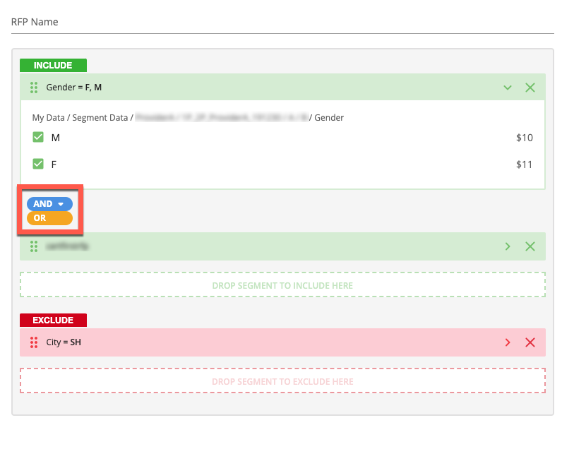 If you want to exclude certain members (or devices) from the RFP, drag an additional segment category or value into the EXCLUDE box.