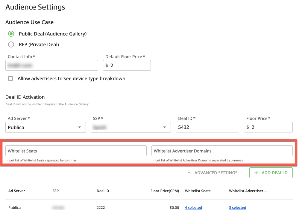 To enter whitelist seats and whitelist advertiser domains, click the ADVANCED SETTINGS text and then enter the desired values, separated by commas.
