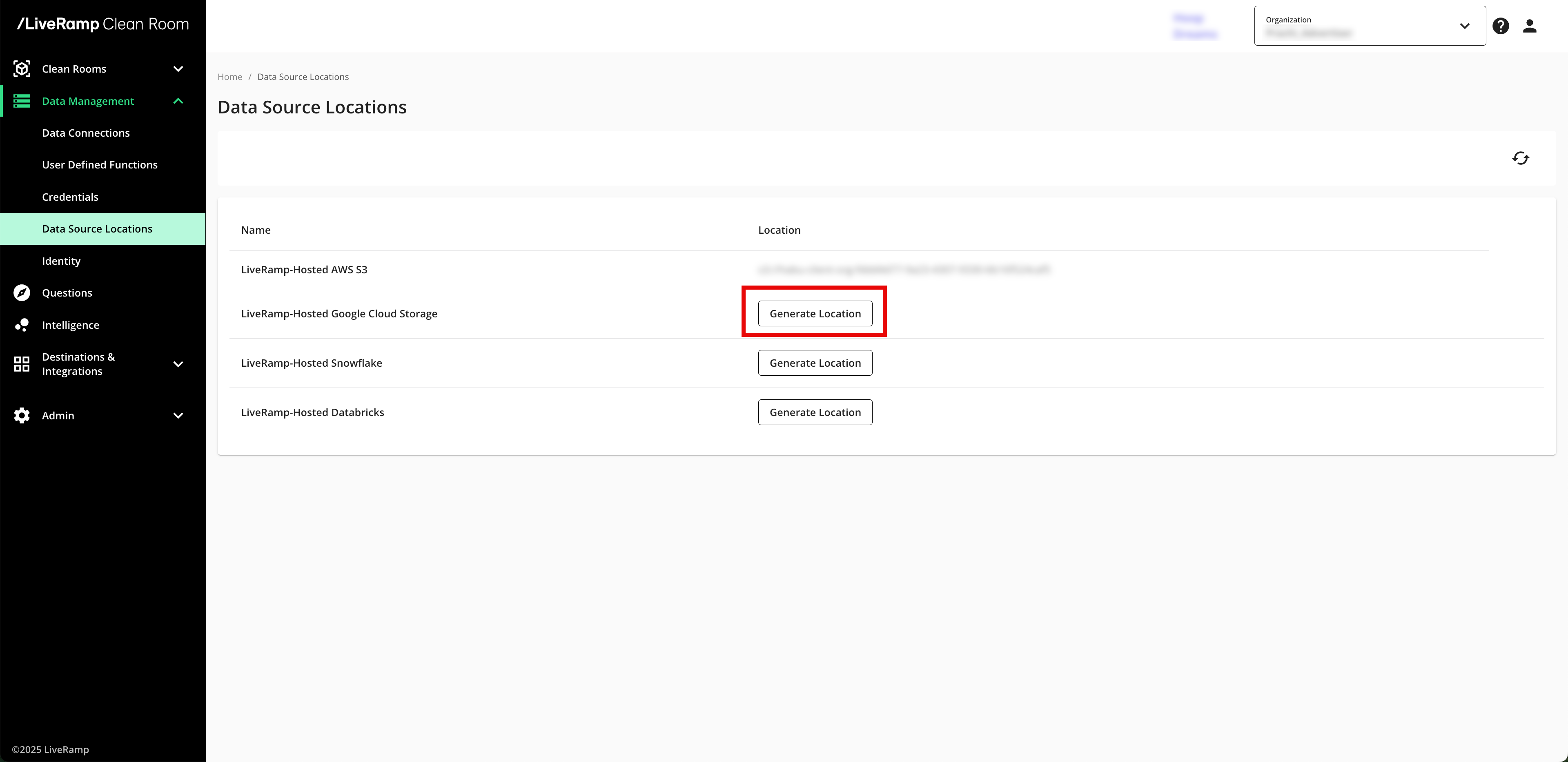 From the navigation menu, select Clean Room → Data Source Locations to open the Data Source Locations page.