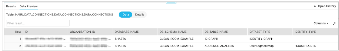 "HABU_DATA_CONNECTIONS" stores the metadata information for LiveRamp Clean Room (i.e., Columns and Column Data Types) and the identity graph (i.e., Parent’s ID).